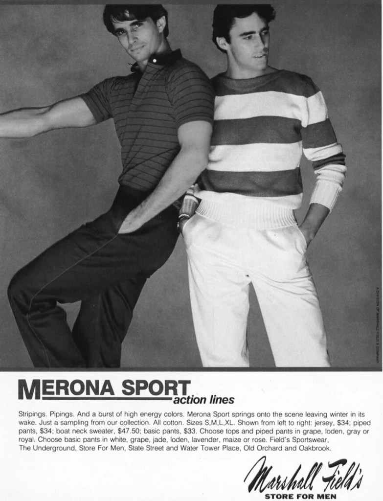 The preppy style started as a defiant and young revolution to bring an informal and sporting style to the formal conventions of college life. As these young aristocrats entered the professional arena, they would not relinquish their style, keeping their relaxed clothing. Within a few years of sports coats and loafers in executive clubs, preppy established itself as the norm, becoming synonymous with “traditional.” Preppy was a sign of social mobility, signifying an upward trajectory within the economic landscape and the realization of the American Dream. Every mother wanted this for her child; mine was no different. As my college entry date approached in 1989, she would return from shopping with bags from Brooks Brothers, Ralph Lauren, and Lacoste. These offerings were intended to make me presentable at church, restaurants, and the country club. When she returned with a shopping bag from Rich’s, I knew the contents would contain preppy clothes that were colorful with deep hues, rich in texture, and intricate with patterns from a brand exclusive to the upscale department store: Merona Sport.