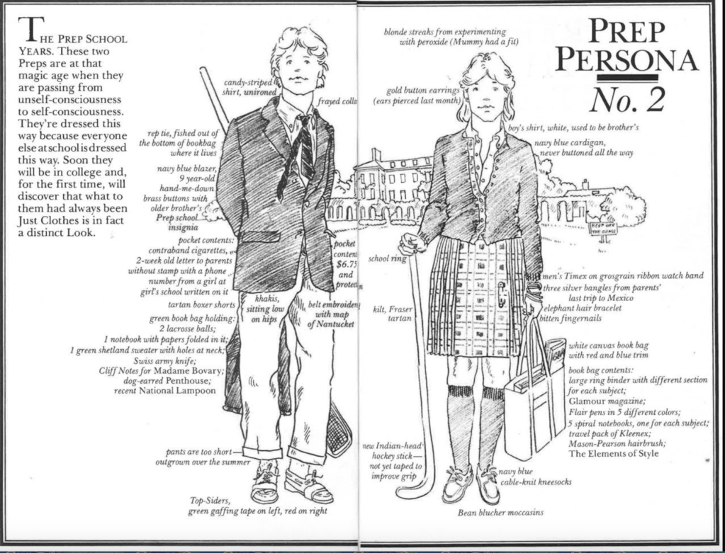 At the turn of the twentieth century, wealthy men attending elite colleges in the American Northeast began expressing their youthful vigor and social status sartorially. Rebelling from the more formal style of their fathers, undergraduates adopted button-down shirts and knit v-neck sweaters combined with pleated flannel trousers, tweed jackets, navy sports coats, and patterned socks tucked into moccasins and sneakers to define the leisure and sporting style of the American elite attending a university. Many of these white men attended preparatory schools meant to funnel students into the Ivy League. By the 1920s, the relaxed style these collegians heralded became known as “preppy.” The preppy style was targeted by retailers like Brooks Brothers and J. Press, featured in magazines and movies, and lampooned in Lisa Birnbach’s The Official Preppy Handbook. In 1982, Preppie!, an action video game from Adventure International, was one of the best-selling cartridges for the Atari home video console.