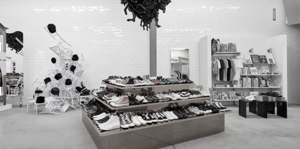 With so much uncertainty, we must examine the known facts of Kawakubo and her artistic output. She is the sole owner of Comme des Garçons, a veritable accomplishment in the world of fashion conglomerates. Within the Comme des Garçons company, she operates boutiques throughout the world and produces a number of lines, including Comme des Garçons Homme, Homme Deux, Homme Plus, Shirt, Black, Play, CDG, Junya Watanabe, and Noir by Kei Ninomiya. She lives in a Tokyo apartment, and her only revelation about any indulgence is her 1970s vintage Mitsubishi. She invented the pop-up shop retail experience. Now, she has evolved, offering Dover Street Market, a boutique featuring the elements of an old-school department store offering myriad luxuries, a futuristic retail experience with ever-changing interiors, and an exhibition space devoted to priceless finds. Kawakubo’s newest venture is The Trading Museum. The once-again reinvented retail space heavily focuses on the elements of a museum, offering the most unique and coveted fashion pieces in cases borrowed from London’s Victoria & Albert Museum.